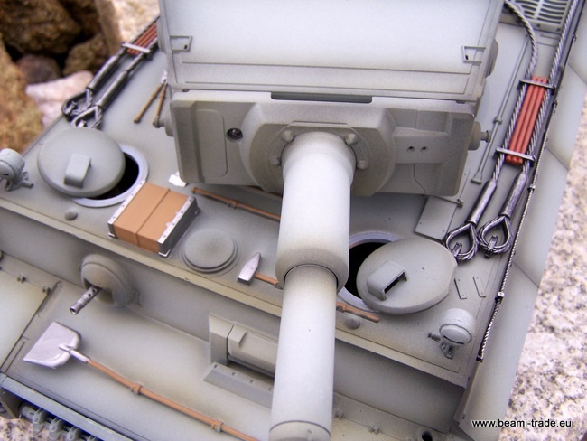 Historie modelu:Tiger se stal bezesporu nejslavnějším německým tankem druhé světové války a jedním z nejslavnějších tanků historie vůbec. Jeho jméno zaznělo snad v každém válečném filmu a stalo se symbolem německé tankové techniky. A to všechno přesto, že jich bylo, ve srovnání s jinými stroji, vyrobeno jen velmi malé množství. I přes nepříznivé počty to byl ve své době král bojiště. Bilance vítězství tanků Tiger byla někdy až neuvěřitelná. 4. listopadu 1943 například jediný Tiger hlídkující na silnici mezi městy Nebel a Vitebsk zničil deset tanků T-34. Byl to stroj, kterému velel Otto Carius, jedno z největších tankových es války. Carius zpozoroval dvanáct sovětských tanků již na velkou vzdálenost ale nechal je, sám ukrytý v maskovaném postavení, přijet až na pouhých šedesát metrů než vydal příkaz k palbě. Překvapení Sověti se nezmohli téměř k žádnému odporu a jen dvěma jejich tankům se podařilo z bojiště ujet. Ještě kurióznější je ovšem skutečnost, že na stejném místě hlídkoval Cariusův Tiger i o dva dny později. Tehdy dorazila na bojiště skupina pěti T-34 aby si prohlédly co zbylo z tanků jejich spolubojovníků. Tentokrát Cariusovi neunikl ani jeden sovětský tank. Rovněž nejúspěšnější tankista druhé světové války Michael Wittmann získal nemalou část svých ostruh právě na tanku Tiger. Legendárním se stalo jeho bojové vystoupení ve francouzské vesnici Villers Bocage 13. června 1944. Jeho Tiger zde toho dne zlikvidoval 27 vozidel protivníka! Kuriózní vítězství si na svůj účet připsal Feldwebel Kramer z 2. roty 502. praporu, jehož tanku Tiger se podařilo 16. prosince 1943 sestřelit tříštivotrhavým granátem letoun Iljušin Il-2. |